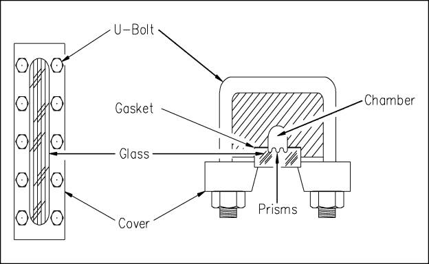 Figure 2 Gauge Glass Another type of gauge glass is the reflex gauge glass (Figure 3). In this type, one side of the glass section is prism-shaped. The glass is molded such that one side has 90-degree angles which run lengthwise. Light rays strike the outer surface of the glass at a 90-degree angle. The light rays travel through the glass striking the inner side of the glass at a 45-degree angle. The presence or absence of liquid in the chamber determines if the light rays are refracted into the chamber or reflected back to the outer surface of the glass.