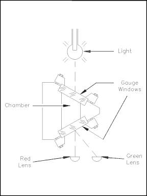 Figure 3 Reflex Gauge Glass When the liquid is at an intermediate level in the gauge glass, the light rays encounter an air-glass interface in one portion of the chamber and a water-glass interface in the other portion of the chamber. Where an air-glass interface exists, the light rays are reflected back to the outer surface of the glass since the critical angle for light to pass from air to glass is 42 degrees. This causes the gauge glass to appear silvery-white. In the portion of the chamber with the water-glass interface, the light is refracted into the chamber by the prisms. Reflection of the light back to the outer surface of the gauge glass does not occur because the critical angle for light to pass from glass to water is 62-degrees. This results in the glass appearing black, since it is possible to see through the water to the walls of the chamber which are painted black. A third type of gauge glass is the refraction type (Figure 4). This type is especially useful in areas of reduced lighting; lights are usually attached to the gauge glass. Operation is based on the principle that the bending of light, or refraction, will be different as light passes through various media. Light is bent, or refracted, to a greater extent in water than in steam. For the portion of the chamber that contains steam, the light rays travel relatively straight, and the red lens is illuminated. For the portion of the chamber that contains water, the light rays are bent, causing the green lens to be illuminated. The portion of the gauge containing water appears green; the portion of the gauge from that level upward appears red.