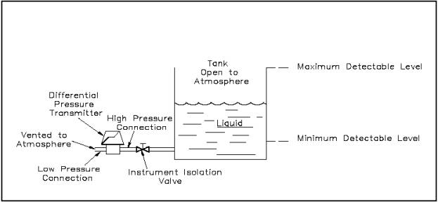 Figure 9 Open Tank Differential Pressure Detector The tank is open to the atmosphere; therefore, it is necessary to use only the high pressure (HP) connection on the OP transmitter. The low pressure (LP) side is vented to the atmosphere; therefore, the pressure differential is the hydrostatic head, or weight, of the liquid in the tank. The maximum level that can be measured by the OP transmitter is determined by the maximum height of liquid above the transmitter. The minimum level that can be measured is determined by the point where the transmitter is connected to the tank. Not all tanks or vessels are open to the atmosphere. Many are totally enclosed to prevent vapors or steam from escaping, or to allow pressurizing the contents of the tank. When measuring the level in a tank that is pressurized, or the level that can become pressurized by vapor pressure from the liquid, both the high pressure and low pressure sides of the OP transmitter must be connected (Figure 10).