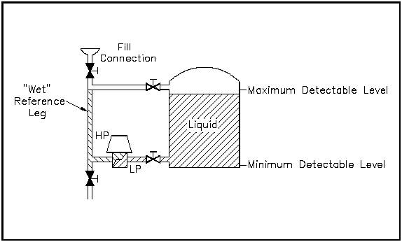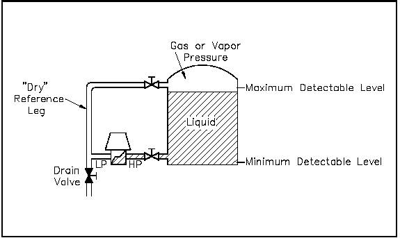 Figure 10 Closed Tank, Dry Reference Leg The high pressure connection is connected to the tank at or below the lower range value to be measured. The low pressure side is connected to a "reference leg" that is connected at or above the upper range value to be measured. The reference leg is pressurized by the gas or vapor pressure, but no liquid is permitted to remain in the reference leg. The reference leg must be maintained dry so that there is no liquid head pressure on the low pressure side of the transmitter. The high pressure side is exposed to the hydrostatic head of the liquid plus the gas or vapor pressure exerted on the liquid's surface. The gas or vapor pressure is equally applied to the low and high pressure sides. Therefore, the output of the OP transmitter is directly proportional to the hydrostatic head pressure, that is, the level in the tank. Where the tank contains a condensible fluid, such as steam, a slightly different arrangement is used. In applications with condensible fluids, condensation is greatly increased in the reference leg. To compensate for this effect, the reference leg is filled with the same fluid as the tank. The liquid in the reference leg applies a hydrostatic head to the high pressure side of the transmitter, and the value of this level is constant as long as the reference leg is maintained full. If this pressure remains constant, any change in OP is due to a change on the low pressure side of the transmitter (Figure 11).