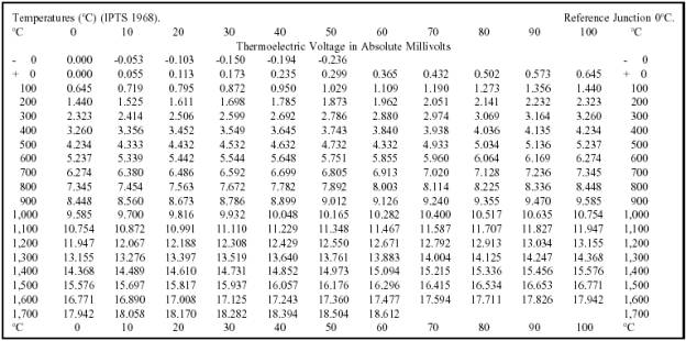 Figure 7 Temperature-vs-Voltage Reference Table Summary Thermocouples are summarized below. Thermocouple Summary A thermocouple is constructed of two dissimilar wires joined at one end and encased in a metal sheath. The other end of each wire is connected to a meter or measuring circuit. Heating the measuring junction of the thermocouple produces a voltage that is greater than the voltage across the reference junction. The difference between the two voltages is proportional to the difference in temperature and can be measured on a voltmeter.