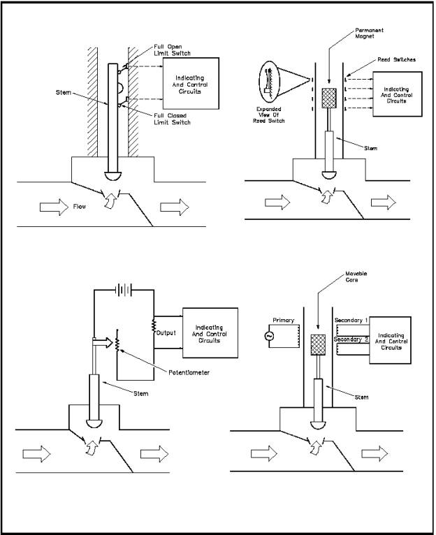 Valve position circuitry provides indication and control functions. EO 1.4 Given a diagram of a position indicator, STATE the purpose of the following components: a. Detection device b. Indicator and control circuits EO 1.5 STATE the two environmental concerns which can affect the accuracy and reliability of position indication equipment. As described above, position detection devices provide a method to determine the position of a valve or control rod. The four types of position indicators discussed were limit switches, reed switches, potentiometer valve position indicators, and LVDTs (Figure 7). Reed and limit switches act as ON/OFF indicators to provide open and closed indications and control functions. Reed switches can also be used to provide coarse, incremental position indication. Potentiometer and LVDT position indicators provide accurate indication of valve and rod position throughout their travel. In some applications, LVDTs can be used to indicate open and closed positions when small secondary windings are used at either end of the valve stem stroke. The indicating and control circuitry provides for remote indication of valve or rod position and/or various control functions. Position indications vary from simple indications such as a light to meter indications showing exact position. Control functions are usually in the form of interlocks. Pump isolation valves are sometimes interlocked with the pump. In some applications, these interlocks act to prevent the pump from being started with the valves shut. The pump/valve interlocks can also be used to automatically turn off the pump if one of its isolation valves go shut or to open a discharge valve at some time interval after the pump starts. Valves are sometimes interlocked with each other. In some systems, two valves may be interlocked to prevent both of the valves from being opened at the same time. This feature is used to prevent undesirable system flowpaths. Control rod interlocks are normally used to prevent outward motion of certain rods unless certain conditions are met. One such interlock does not allow outward motion of control rods until the rods used to scram the reactor have been withdrawn to a predetermined height. This and all other rod interlocks ensure that the safety of the reactor remains intact.