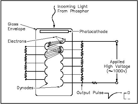 Figure 26 Photomultiplier Tube Schematic Diagram The photoelectrons strike the first dynode with sufficient energy to liberate several new electrons for each photoelectron. The second-generation electrons are, in turn, attracted to the second dynode where a larger third-generation group of electrons is emitted. This amplification continues through 10 to 12 stages. At the last dynode, sufficient electrons are available to form a current pulse suitable for further amplification by transistor circuits. The voltage drops between dynodes are established by a single external bias, approximately 1000 volts dc, and a network of external resistors to equalize the voltage drops. The advantages of a scintillation counter are its efficiency and the high precision and counting rates that are possible. These latter attributes are a consequence of the extremely short duration of the light flashes, from about 10-9 to 10-6 seconds. The intensity of the light flash and the amplitude of the output voltage pulse are proportional to the energy of the particle responsible for the flash. Consequently, scintillation counters can be used to determine the energy, as well as the number, of the exciting particles (or gamma photons). The photomultiplier tube output is very useful in radiation spectrometry (determination of incident radiation energy levels). Summary The operation of scintillation counters is summarized below. Scintillation Counter Summary Radiation interactions with a crystal center cause electrons to be raised to an excited state. When the center de-excites, the crystal emits a photon in the visible light range. Three classes of phosphors are used: inorganic crystals, organic crystals, and plastic phosphors. The photon, emitted from the phosphor, interacts with the photocathode of a photomultiplier tube, releasing electrons. Using a voltage potential, the electrons are attracted and strike the nearest dynode with enough energy to release additional electrons. The second-generation electrons are attracted and strike a second dynode, releasing more electrons. This amplification continues through 10 to 12 stages. At the final dynode, sufficient electrons are available to produce a pulse of sufficient magnitude for further amplification.