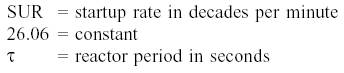 Figure 34 Period Meter Circuit Placing the signal through an RC circuit causes a voltage that is proportional to the reciprocal of the period. If the current output from the ionization chamber is constant, no current flows through resistor R, and the output voltage is zero. This corresponds to an infinite period. As the ion chamber output current changes, there is a voltage transient across capacitor C, and current flows through resistor R. The more rapid the transient, the greater the voltage drop across resistor R, and the shorter the period. Rate information is displayed on a meter in decades per minute, and since it is used by the operator to monitor the rate of change of power during startup, it is termed startup rate. Startup rate (SUR) equates to reactor period using Equation 6-10.