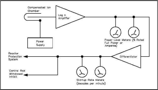INSTRUMENTATION Three ranges are used to monitor the power level of a reactor throughout the full range of reactor operation. The intermediate range makes use of a compensated ion chamber. EO 3.4Given a block diagram of a typical intermediate range instrument, STATE the purpose of major components. a. Log n amplifier b. Differentiator c. Reactor protection interface Intermediate-range nuclear instrumentation consists of a minimum of two redundant channels. Each of these channels is made up of a boron-lined or boron gas-filled compensated ion chamber and associated signal measuring equipment of which the output is a steady current produced by the neutron flux. The compensated ion chamber is utilized in the intermediate range because the current output is proportional to the relatively stable neutron flux, and it compensates for signals from gamma flux. This range of indication also provides a measure of the rate of change of neutron level. This rate of change is displayed on meters in terms of startup rate in decades per minute (-1 to +10 decades per minute). High startup rate on either channel may initiate a protective action. This protective action may be in the form of a control rod withdrawal inhibit and alarm, or a high startup rate reactor trip. Figure 36 shows a typical intermediate-range channel.