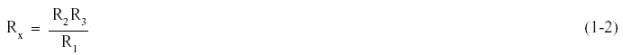 Since the values of R1, R2, and R3 are known values, the only unkown is RX. The value of RX can be calulated for the bridge during an ammeter zero current condition. Knowing this resistance value provides a baseline point for calibration of the instrument attached to the bridge circuit. The unknown resistance, RX, is given by Equation 1-2.