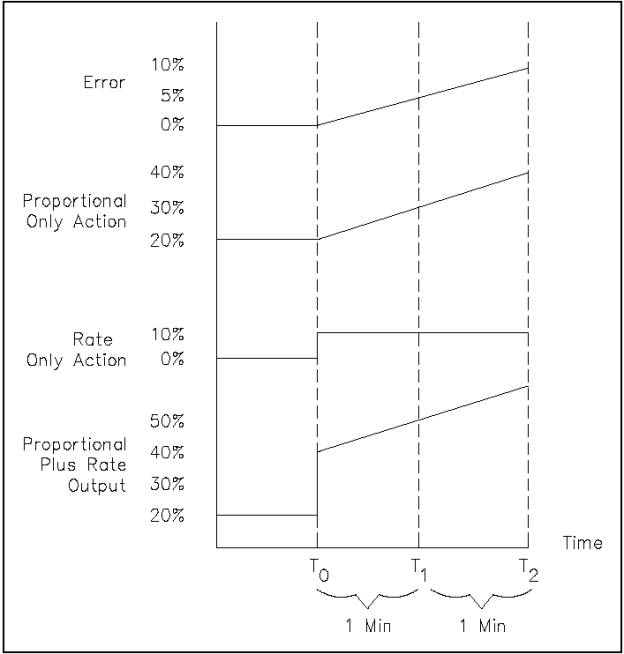 Figure 26 Rate Control Output Derivative cannot be used alone as a control mode. This is because a steady-state input produces a zero output in a differentiator. If the differentiator were used as a controller, the input signal it would receive is the error signal. As just described, a steady-state error signal corresponds to any number of necessary output signals for the positioning of the final control element. Therefore, derivative action is combined with proportional action in a manner such that the proportional section output serves as the derivative section input. Proportional plus rate controllers take advantage of both proportional and rate control modes. As seen in Figure 27, proportional action provides an output proportional to the error. If the error is not a step change, but is slowly changing, the proportional action is slow. Rate action, when added, provides quick response to the error.
