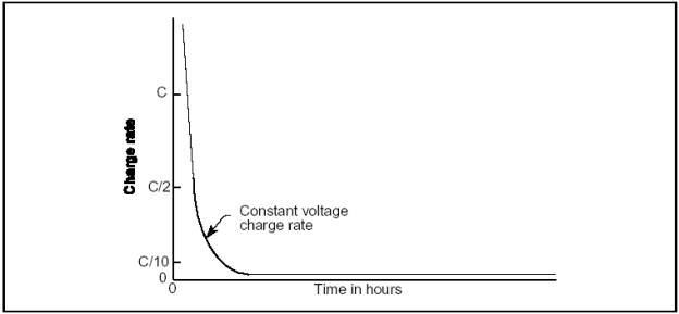 Charging Constant-voltage (often called constant-potential) chargers maintain nearly the same voltage input to the battery throughout the charging process, regardless of the battery's state of charge. Constant-voltage chargers provide a high initial current to the battery because of the greater potential difference between the battery and charger. A constant-voltage charger may return as much as 70% of the previous discharge in the first 30 minutes. This proves useful in many battery applications involving multiple discharge scenarios. As the battery charges its voltage increases quickly. This reduces the potential that has been driving the current, with a corresponding rapid decrease in charge current as depicted in Figure 16. As a result, even though the battery reaches partial charge quickly, obtaining a full charge requires prolonged charging. Given this behavior, constant-voltage chargers are frequently found in applications that normally allow extended charging periods to attain full charge. Constant-voltage chargers should not be used where there is frequent cycling of the battery. Repeated discharges without returning the cell to its full charge will eventually decrease the battery capacity and may damage individual cells. Constant-voltage