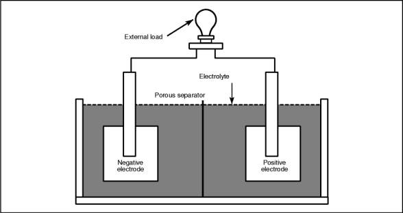 Cells vs. Batteries A battery is a device that converts the chemical energy contained in its active materials into electrical energy by means of an electrochemical reaction. While the term "battery" is often used, the basic electrochemical element being referred to is the cell. A battery consists of two or more cells electrically connected in series to form a unit. In common usage, the terms "battery" and "cell" are used interchangeably. Primary and Secondary Cells and Batteries Batteries are either primary or secondary. Primary batteries can be used only once because the chemical reactions that supply the electrical current are irreversible. Secondary (or storage) batteries can be used, charged, and reused. In these batteries, the chemical reactions that supply electrical current are readily reversed so that the battery is charged. Primary batteries are common since they are cheap and easy to use. Familiar primary battery uses are in flashlights, watches, toys, and radios. The most common use for secondary (storage) batteries is for starting, lighting, and ignition (SLI) in automobiles and engine-generator sets. Other applications include uninterruptible power supplies (UPSs) for emergency and backup power, electric vehicles (traction), telecommunications, and portable tools. The remainder of this Primer will be concerned only with storage batteries except where general operating characteristics of batteries are discussed. Battery Components A cell has five major components as shown in Figure 1. The negative electrode supplies electrons to the external circuit (or load) during discharge. In a fully charged lead-acid storage battery the negative electrode is composed of sponge lead (Pb). The positive electrode accepts electrons from the load during discharge. In a fully charged lead-acid battery the positive electrode is composed of lead dioxide (Pb02). It should be noted that the electrodes in a battery must be of dissimilar materials or the cell will not be able to develop an electrical potential and thus conduct electrical current. The electrolyte completes the internal circuit in the battery by supplying ions to the positive and negative electrodes. Dilute sulfuric acid (H2S04) is the electrolyte in lead-acid batteries. In a fully charged lead-acid battery, the electrolyte is approximately 25% sulfuric acid and 75% water. The separator is used to electrically isolate the positive and negative electrodes. If the electrodes are allowed to come in contact, the cell will short-circuit and become useless because both electrodes would be at the same potential. The type of separator used varies