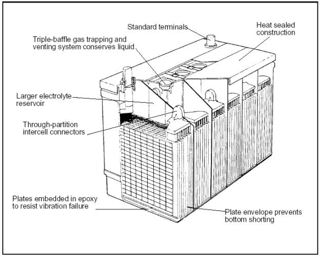 Figure 12. Cutaway view of a typical battery used for starting, lighting, and ignition (SLI). and volume ratio, since the vehicle must also carry its power source. Traction batteries are frequently deep cycled and require a fast charging rate for use usually within 24 hours. Typical applications are motive power for fork lifts and electric carts. Traction batteries are usually of the tubular plate design, which performs more favorably during deep cycle operation.
