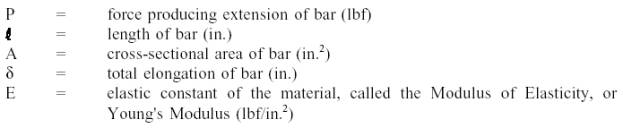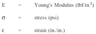The quantity E, the ratio of the unit stress to the unit strain, is the modulus of elasticity of the material in tension or compression and is often called Young's Modulus. Previously, we learned that tensile stress, or simply stress, was equated to the load per unit area or force applied per cross-sectional area perpendicular to the force measured in pounds force per square inch.