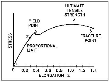 Figure 3 Typical Ductile Material Stress-Strain Curve Hooke's Law applies between Points 1 and 2. Hooke's Law becomes questionable between Points 2 and 3 and strain increases more rapidly.