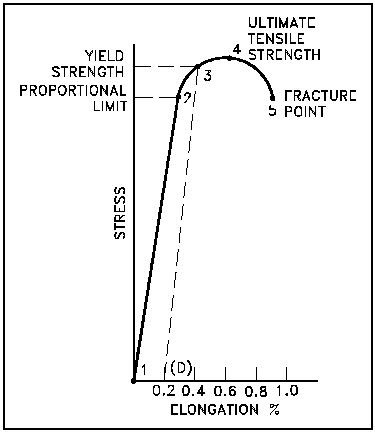 The area between Points I and 2 is called the elastic region. If stress is removed, the material will return to its original length. Point 2 is the proportional limit (PL) or elastic limit, and Point 3 is the yield strength (YS) or yield point. The area between Points 2 and 5 is known as the plastic region because the material will not return to its original length. Point 4 is the point of ultimate strength and Point 5 is the fracture point at which failure of the material occurs. Figure 3 is a stress-strain curve typical of a ductile material where the strength is small, and the plastic region is great. The material will bear more strain (deformation) before fracture. Figure 4 is a stress-strain curve typical of a brittle material where the plastic region is small and the strength of the material is high. The tensile test supplies three descriptive facts about a material. These are the stress at which observable plastic deformation or "yielding" begins; the ultimate tensile strength or maximum intensity of load that can be carried in tension; and the percent elongation or strain (the amount the material will stretch) and the accompanying percent reduction of the cross-sectional area caused by stretching. The rupture or fracture point can also be determined.