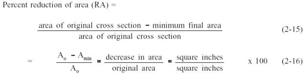 An original area square inches The reduction of area is reported as additional information (to the percent elongation) on the deformational characteristics of the material. The two are used as indicators of ductility, the ability of a material to be elongated in tension. Because the elongation is not uniform over the entire gage length and is greatest at the center of the neck, the percent elongation is not an absolute measure of ductility. (Because of this, the gage length must always be stated when the percent elongation is reported.) The reduction of area, being measured at the minimum diameter of the neck, is a better indicator of ductility. Ductility is more commonly defined as the ability of a material to deform easily upon the application of a tensile force, or as the ability of a material to withstand plastic deformation without rupture. Ductility may also be thought of in terms of bendability and crushability. Ductile materials show large deformation before fracture. The lack of ductility is often termed brittleness. Usually, if two materials have the same strength and hardness, the one that has the higher ductility is more desirable. The ductility of many metals can change if conditions are altered. An increase in temperature will increase ductility. A decrease in temperature will cause a decrease in ductility and a change from ductile to brittle behavior. Irradiation will also decrease ductility, as discussed in Module 5. Cold-working also tends to make metals less ductile. Cold-working is performed in a temperature region and over a time interval to obtain plastic deformation, but not relieving the strain hardening. Minor additions of impurities to metals, either deliberate or unintentional, can have a marked effect on the change from ductile to brittle behavior. The heating of a cold-worked metal to or above the temperature at which metal atoms return to their equilibrium positions will increase the ductility of that metal. This process is called annealing. Ductility is desirable in the high temperature and high pressure applications in reactor plants because of the added stresses on the metals. High ductility in these applications helps prevent brittle fracture, which is discussed in Module 4.