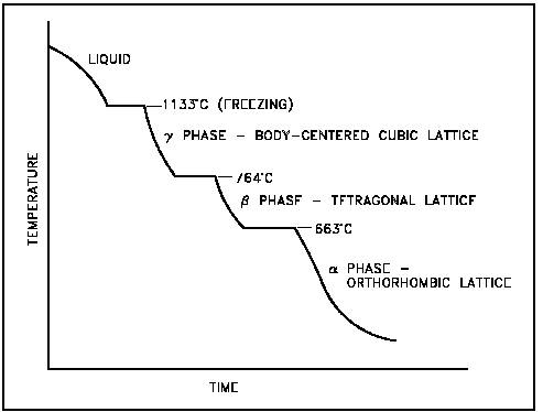 Figure 5 Cooling Curve for Unalloyed Uranium 1. The alpha phase, from room temperature to 663C 2. The beta phase, from 663C to 764C 3. The gamma phase, from 764C to its melting point of 1133C
