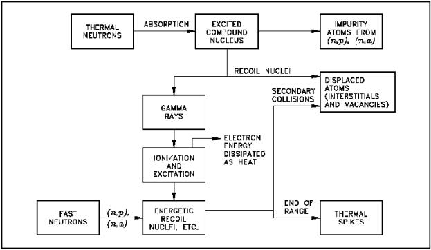 Figure 3 Thermal and Fast Neutrons Interactions with a Solid The target nucleus (or recoiling atom) that is displaced is called a knocked-on nucleus or just a knock-on (or primary knock-on). When a metal atom is ejected from its crystal lattice the vacated site is called a vacancy. The amount of energy required to displace an atom is called displacement energy. The ejected atom will travel through the lattice causing ionization and heating. If the energy of the knock-on atom is large enough, it may in turn produce additional collisions and knock-ons. These knock-ons are referred to as secondary knock-ons. The process will continue until the displaced atom does not have sufficient energy to eject another atom from the crystal lattice. Therefore, a cascade of knock-on atoms will develop from the initial interaction of a high energy radiation particle with an atom in a solid. This effect is especially important when the knock-on atom (or nucleus) is produced as the result of an elastic collision with a fast neutron (or other energetic heavy particle). The energy of the primary knock-on can then be quite high, and the cascade may be extensive. A single fast neutron in the greater than or equal to 1 MeV range can displace a few thousand atoms. Most of these displacements are temporary. At high temperatures, the number of permanently displaced atoms is smaller than the initial displacement. During a lengthy irradiation (for large values of the neutron fluence), many of the displaced atoms will return to normal (stable) lattice sites (that is, partial annealing occurs spontaneously). The permanently displaced atoms may lose their energy and occupy positions other than normal crystal lattice sites (or nonequilibrium sites), thus becoming interstitials. The presence of interstitials and vacancies makes it more difficult for dislocations to move through the lattice. This increases the strength and reduces the ductility of a material. At high energies, the primary knock-on (ion) will lose energy primarily by ionization and excitation interactions as it passes through the lattice, as shown in Figure 3. As the knock-on loses energy, it tends to pick up free electrons which effectively reduces its charge. As a result, the principle mechanism for energy losses progressively changes from one of ionization and excitation at high energies to one of elastic collisions that produce secondary knock-ons or displacements. Generally, most elastic collisions between a knock-on and a nucleus occur at low kinetic energies below A keV, where A is the mass number of the knock-on. If the kinetic energy is greater than A keV, the probability is that the knock-on will lose much of its energy in causing ionization. Summary The important information in this chapter is summarized below. Atomic Displacement Due To Irradiation Summary Beta and gamma radiation produce ionization and excitation of electrons, which does very little damage. Heavier particles, such as protons, (x-particles, fast neutrons, and fission fragments, usually transfer energy through elastic or inelastic collisions to cause radiation damage. These particles in organic material break the chemical bonds, which will change the material's properties. Knock-on is a target nucleus (or recoiling atom) that is displaced. Vacancy is the vacated site when a metal atom is ejected from its crystal lattice. Interstitial is a permanently displaced atom that has lost its energy and is occupying a position other than its normal crystal lattice site.