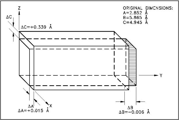 The alpha (a) phase is stable at room temperature and has a crystal system characterized by three unequal axes at right angles. In the alpha phase, the properties of the lattice are different in the X, Y, and Z axes. This is because of the regular recurring state of the atoms is different. Because of this condition, when heated the phase expands in the X and Z directions and shrinks in the Y direction. Figure 6 shows what happens to the dimensions (A = angstrom, one hundred-millionth of a centimeter) of a unit cell of alpha uranium upon being heated. As shown, heating and cooling of alpha phase uranium can lead to drastic dimensional changes and gross distortions of the metal. Thus, pure uranium is not used as a fuel, but only in alloys or compounds.