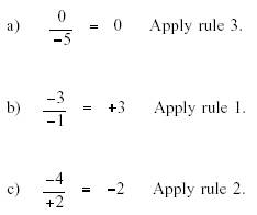 Zero times any number equals zero. Multiplying by -1 is the equivalent of changing the sign. Division Division of signed numbers may be performed using the following rules: Rule 1: The quotient of any two numbers with like signs is positive: (+)/(+) = (+) or (-)/(-) = (+) Rule 2: The quotient of any two numbers with unlike signs is negative: (+)/(-) = (-) or (-)/(+) = (-) Rule 3: Zero divided by any number not equal to zero is zero. Examples: