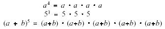 The product a x a x a x a can be written as a4, where 4 is called the exponent of a or power to which a is raised. In this notation, a is often called the base. Examples: