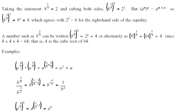 Any number to the zero power equals one. The rules for positive exponents apply to negative exponents. The rules for integer exponents apply to fractional exponents.