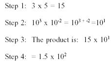 When multiplying two or more numbers in scientific notation, the following steps must be used. Step 1:Multiply the decimal numbers and obtain the product. Step 2:Multiply the powers of ten together by adding the exponents. Step 3:Put the product in single-digit scientific notation. Step 4:If necessary, rewrite decimal with a single number to the left of the decimal point. Example: Multiply (3 x 103)(5 x 10-2) Solution: