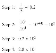 Division Follow the steps listed below when dividing numbers in scientific notation. Step 1:Divide one decimal into the other. Step 2:Divide one power of ten into the other by subtracting the exponents. Step 3:Put product in single-digit scientific notation. Step 4:If necessary, rewrite decimal with a single number to the left of the decimal point. Example:
