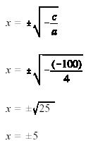 Example: Find the roots of the following pure quadratic equation. 4x2- 100=0 Solution: Using Equation 2-3, substitute the values of c and a and solve for x.