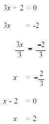 Now, if one is given an equation ax2 + bx + c = 0, he knows that the symbol a is the product of two numbers (df) and c is also the product of two numbers. For the example 3x2 - 4x - 4 = 0, it is a reasonable guess that the numbers multiplying x2 in the two factors are 3 and 1, although they might be 1.5 and 2. The last -4 (c in the general equation) is the product of two numbers (eg), perhaps -2 and 2 or -1 and 4. These combinations are tried to see which gives the proper value of b (dg + ef), from above. There are four steps used in solving quadratic equations by factoring. Step 1.Using the addition and subtraction axioms, arrange the equation in the general quadratic form ax2 + bx + c = 0. Step 2.Factor the left-hand side of the equation. Step 3.Set each factor equal to zero and solve the resulting linear equations. Step 4.Check the roots. Example: Solve the following quadratic equation by factoring. 2x2-3=4x-x2+1 Solution: Step 1. Using the subtraction axiom, subtract (4x - x2 + 1) from both sides of the equation. 2x2-3-(4x-x2+1) =4x-x2+1-(4x-x2+1) 3x2-4x-4 =0 Step 2. Factor the resulting equation. 3x2-4x-4 =0 (3x + 2)(x - 2) = 0 Step 3. Set each factor equal to zero and solve the resulting equations.