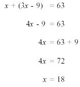 Answers: Winning Team's Score = 21 points Losing Team's Score = 14 points Step 5. The winning team's score is 7 points less than twice the score of the losing team. 2(14) - 7 = 28 - 7 = 21 points The total score of both teams is 35 points. 21 + 14 = 35 points Thus, the answers check. Example 4: A man is 21 years older than his son. Five years ago he was four times as old as his son. How old is each now? Solution: Step 1. Let x = Son's Age Now Step 2. Then, x + 21 = Father's Age Now x - 5 = Son's Age Five Years Ago (x + 21) - 5 = Father's Age Five Years Ago Step 3. Five years ago the father was four times as old as his son. (x+21)-5=4(x-5) Step 4. (x+21)-5 = 4(x-5) x+16 =4x-20 x-4x =-20- 16 -3x = -36 x = 12 years Solving for the other unknowns: x+21 = 12+21 x + 21 = 33 years Answers: Son's Age Now = 12 years Father's Age Now = 33 years Step 5. The man is 21 years older than his son. 12+21=33 years Five years ago he was four times as old as his son. 33-5=28=4(12-5)=4x7 Thus, the answers check.