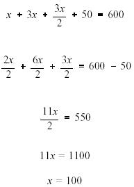 Answer: Capacity of the Smaller Tank = 18 gallons Capacity of the Larger Tank = 45 gallons Step 5.The larger tank holds 9 gallons less than three times the smaller tank. 3(18)-9=54-9=45 The total capacity of the two tanks is 63 gallons. 18+45=63 Thus, the answers check. Example 2: A utility has three nuclear facilities that supply a total of 600 megawatts (Mw) of electricity to a particular area. The largest facility has a total electrical output three times that of the smallest facility. The third facility has an output that is 50 Mw more than half that of the largest facility. What is the electrical output of each of the three facilities? Solution: Step 1.Let x = Electrical Output of the Smallest Facility. Step 2.Then, 3x = Electrical Output of the Largest Facility, and,