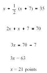 The total output of the three facilities is 600 Mw. 100 + 200 + 300 = 600 Thus, the answers check. Example 3: The winning team in a football game scored 7 points less than twice the score of the losing team. If the total score of both teams was 35 points, what was the final score? Solution: Step 1.Let x = Winning Team's Score Step 2.Then, Step 3.Total Score = Winning Team's Score + Losing Team's Score