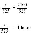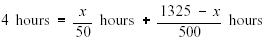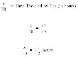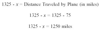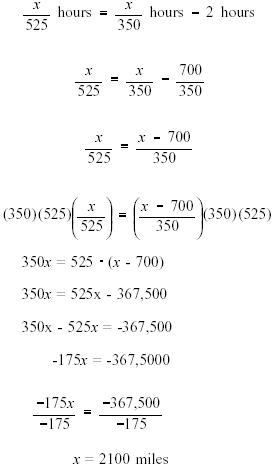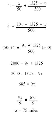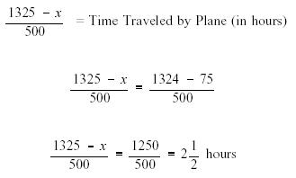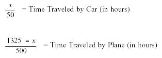 Answers: Distance Traveled = 2100 miles Time Taken by Faster Plane = 4 hours Time Taken by Slower Plane = 6 hours Step 5.The faster plane takes 2 hours less to complete the trip than the slower plane. 6 hours - 2 hours = 4 hours Thus, the answer checks. Example 2: It takes a man 4 hours to reach a destination 1325 miles from his home. He drives to the airport at an average speed of 50 miles per hour, and the average speed of his plane trip is 500 miles per hour. How far does he travel by each mode of transportation? Solution: Step 1.Let x = Distance Traveled by Car (in miles) Step 2.Then, 1325 - x = Distance Traveled by Plane (in miles) and, using Equation 2-14,