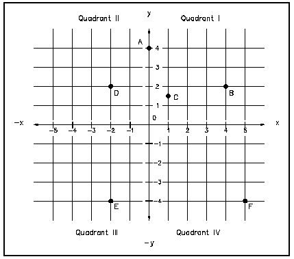 Figure 1 The Cartesian System The use of a graph starts with the plotting of data points using the coordinate system. These data points are known as the abscissa and the ordinate. The abscissa, also known as the y-coordinate, is the distance along the y-axis. The ordinate, also known as the x-coordinate, is the distance along the x-axis. A point on a Cartesian coordinate graph is specified by giving its x-coordinate and its y-coordinate. Positive values of the x-coordinate are measured to the right, negative values to the left. Positive values of the y-coordinate are measured up, negative values down. For example, the x- and y-coordinates are both zero at the origin. The origin is denoted as (0,0), where the first zero refers to the value of the x-coordinate. Point A in Figure 1 is denoted as (0,4), since the value of the x-coordinate is zero, and the value of the y-coordinate is 4. In Quadrant I, every point has a positive x-coordinate and a positive y-coordinate. Point B in Figure 1 is located in Quadrant I and is denoted by (4,2). Fractional values of coordinates can also be shown. Point C in Figure 1 is denoted by (1,1.5). In Quadrant II, every point has a negative x-coordinate and a positive y-coordinate. Point D is denoted by (-2,2). In Quadrant III, every point has a negative x-coordinate and a negative y-coordinate. Point E is located in Quadrant III and is denoted by (-2,-4). In Quadrant IV, every point has a positive x-coordinate, but a negative y-coordinate. Point F is located in Quadrant IV and is denoted by (5,-4).