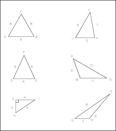 This chapter covers the calculation of the perimeter and area of selected plane figures. EO 1.3 STATE the definition of the following types of triangles: a. Equilateral b. Isosceles c. Acute d. Obtuse e. Scalene EO 1.4 Given the formula, CALCULATE the area and the perimeter of each of the following basic geometric shapes: a. Triangle b. Parallelogram c. Circle The terms and properties of lines, angles, and circles may be applied in the layout, design, development, and construction of closed flat shapes. A new term, plane, must be understood in order to accurately visualize a closed, flat shape. A plane refers to a flat surface on which lies a straight line connecting any two points. A plane figure is one which can be drawn on a plane surface. There are many types of plane figures encountered in practical problems. Fundamental to most design and construction are three flat shapes: the triangle, the rectangle, and the circle. Triangles A triangle is a figure formed by using straight line segments to connect three points that are not in a straight line.The straight line segments are called sides of the triangle. Examples of a number of types of triangles are shown in Figure 8. An equilateral triangle is one in which all three sides and all three angles are equal. Triangle ABC in Figure 8 is an example of an equilateral triangle. An isosceles triangle has two equal sides and two equal angles (triangle DEF). A right triangle has one of its angles equal to 90 and is the most important triangle for our studies (triangle GHI). An acute triangle has each of its angles less than 90 (triangle JKL). Triangle MNP is called a scalene triangle because each side is a different length. Triangle QRS is considered an obtuse triangle since it has one angle greater than 90. A triangle may have more than one of these attributes. The sum of the interior angles in a triangle is always 180.