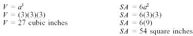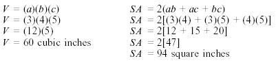 the volume and surface area of a rectangular solid with a = 3", b = 4", and c