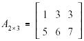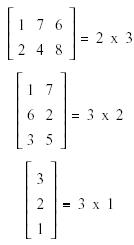 The numbers used in the matrix are called elements. In the example given, we have three columns and two rows of elements. The number of rows and columns are used to determine the dimensions of the matrix. In our example, the dimensions of the matrix are 2 x 3, having 2 rows and 3 columns of elements. In general, the dimensions of a matrix which have m rows and n columns is called an m x n matrix. A matrix with only a single row or a single column is called either a row or a column matrix. A matrix which has the same number of rows as columns is called a square matrix. Examples of matrices and their dimensions are as follows: