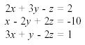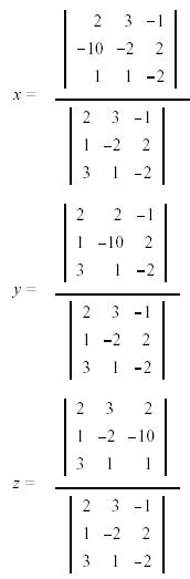 A 3 x 3 is solved by using the same logic, except each 3 x 3 must be expanded by minors to solve for the determinant. Example: Given the following three equations, solve for the three unknowns.