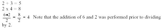 Mathematical operations such as addition, subtraction, multiplication, and division are usually performed in a certain order or sequence. Typically, multiplication and division operations are done prior to addition and subtraction operations. In addition, mathematical operations are also generally performed from left to right using this heirarchy. The use of parentheses is also common to set apart operations that should be performed in a particular sequence. Example: Perform the following mathematical operations to solve for the correct answer: