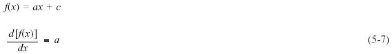 The derivative of the function f(x) = ax + c (compare to slope m from general form of linear equation, y = mx + b), where a and c are constants, is a. The graph of such a function is a straight line having a slope equal to a.