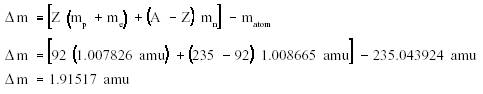 Example: Calculate the mass defect and binding energy for uranium-235. One uranium-235 atom has a mass of 235.043924 amu. Solution: Step 1: Calculate the mass defect using Equation (1-1).