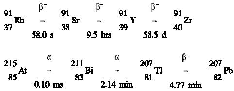 When an unstable nucleus decays, the resulting daughter nucleus is not necessarily stable. The nucleus resulting from the decay of a parent is often itself unstable, and will undergo an additional decay. This is especially common among the larger nuclides. It is possible to trace the steps of an unstable atom as it goes through multiple decays trying to achieve stability. The list of the original unstable nuclide, the nuclides that are involved as intermediate steps in the decay, and the final stable nuclide is known as the decay chain. One common method for stating the decay chain is to state each of the nuclides involved in the standard ZX format. Arrows are used between nuclides to indicate where decays occur, with the type of decay indicated above the arrow and the half-life below the arrow. The half-life for decay will be discussed in the next chapter. Example: Write the decay chains for rubidium-91 and actinium-215. Continue the chains until a stable nuclide or a nuclide with a half-life greater than 1 x 106 years is reached. Solution: