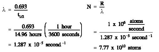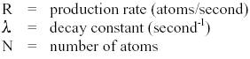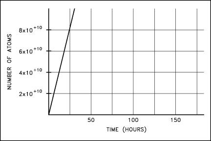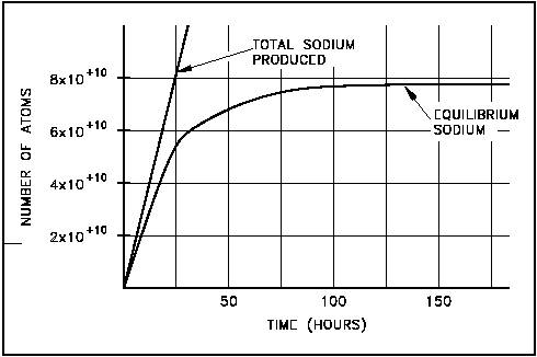 Equilibrium Radioactive equilibrium exists when a radioactive nuclide is decaying at the same rate at which it is being produced. Since the production rate and decay rate are equal, the number of atoms present remains constant over time. An example of radioactive equilibrium is the concentration of sodium-24 in the coolant circulating through a sodium-cooled nuclear reactor. Assume that the sodium-24 is being produced at a rate of 1 x 106 atoms per second. If the sodium-24 were stable and did not decay, the amount of sodium-24 present after some period of time could be calculated by multiplying the production rate by the amount of time. Plotting the amount of material present would result in the graph in Figure 13. However, sodium-24 is not stable, and it decays with a half-life of 14.96 hours.If no sodium-24 is present initially and production starts at a rate of 1 x 106 atoms per second, the rate of decay will initially be zero because there is no sodium-24 present to decay. The rate of decay of sodium-24 will increase as the amount of sodium-24 increases.