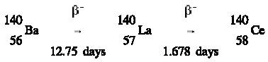 Figure 15 Transient Equilibrium in the Decay of Barium-140 Secular equilibrium occurs when the parent has an extremely long half-life. In the long decay chain for a naturally radioactive element, such as thorium-232, where all of the elements in the chain are in secular equilibrium, each of the descendants has built up to an equilibrium amount and all decay at the rate set by the original parent. The only exception is the final stable element on the end of the chain. Its number of atoms is constantly increasing. Summarv The important information in this chapter is summarized on the following page. Radioactivity Summary Radioactivity is the decay of unstable atoms by the emission of particles and electromagnetic radiation. A curie (Ci) is a unit of radioactivity equal to 3.7 x 10O disintegrations per second. A becquerel (Bq) is a unit of radioactivity equal to I disintegration per second. The