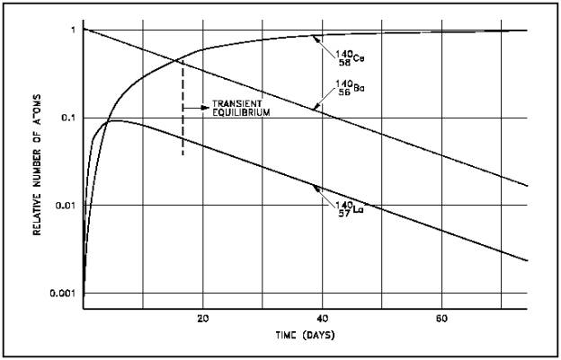 Radioactive Equilibrium Transient radioactive equilibrium occurs when the parent nuclide and the daughter nuclide decay at essentially the same rate. For transient equilibrium to occur, the parent must have a long half-life when compared to the daughter. An example of this type of compound decay process is barium-140, which decays by beta emission to lanthanum-140, which in turn decays by beta emission to stable cerium-140.