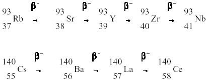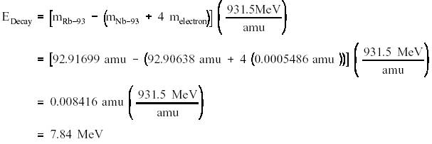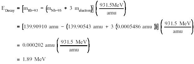 The energy released during the decay for each chain will be equivalent to the mass difference between the original fission product and the sum of the final stable nuclide and the beta particles emitted. The energy released in the decay chain of rubidium-93 is calculated below.