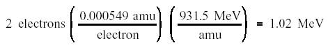 Radiation Alpha radiation is normally produced from the radioactive decay of heavy nuclides and from certain nuclear reactions. The alpha particle consists of 2 neutrons and 2 protons, so it is essentially the same as the nucleus of a helium atom. Because it has no electrons, the alpha particle has a charge of +2. This positive charge causes the alpha particle to strip electrons from the orbits of atoms in its vicinity. As the alpha particle passes through material, it removes electrons from the orbits of atoms it passes near. Energy is required to remove electrons and the energy of the alpha particle is reduced by each reaction. Eventually the particle will expend its kinetic energy, gain 2 electrons in orbit, and become a helium atom. Because of its strong positive charge and large mass, the alpha particle deposits a large amount of energy in a short distance of travel. This rapid, large deposition of energy limits the penetration of alpha particles. The most energetic alpha particles are stopped by a few centimeters of air or a sheet of paper. Beta-Minus Radiation A beta-minus particle is an electron that has been ejected at a high velocity from an unstable nucleus. An electron has a small mass and an electrical charge of -1. Beta particles cause ionization by displacing electrons from atom orbits. The ionization occurs from collisions with orbiting electrons. Each collision removes kinetic energy from the beta particle, causing it to slow down. Eventually the beta particle will be slowed enough to allow it to be captured as an orbiting electron in an atom. Although more penetrating than the alpha, the beta is relatively easy to stop and has a low power of penetration. Even the most energetic beta radiation can be stopped by a few millimeters of metal. Positron Radiation Positively charged electrons are called positrons. Except for the positive charge, they are identical to beta-minus particles and interact with matter in a similar manner. Positrons are very short-lived, however, and quickly are annihilated by interaction with a negatively charged electron, producing two gammas with a combined energy (calculated below) equal to the rest mass of the positive and negative electrons.