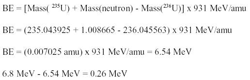 The difference between the binding energy and the quantum energy level equals the amount of kinetic energy the neutron must possess. The typical heavy nucleus will have many closelyspaced resonances starting in the low energy (eV) range. This is because heavy nuclei are complex and have more possible configurations and corresponding energy states. Light nuclei, being less complex, have fewer possible energy states and fewer resonances that are sparsely distributed at higher energy levels. For higher neutron energies, the absorption cross section steadily decreases as the energy of the neutron increases. This is called the "fast neutron region." In this region the absorption cross sections are usually less than 10 barns. With the exception of hydrogen, for which the value is fairly large, the elastic scattering cross sections are generally small, for example, 5 barns to 10 barns. This is close to the magnitude of the actual geometric cross sectional area expected for atomic nuclei. In potential scattering, the cross section is essentially constant and independent of neutron energy. Resonance elastic scattering and inelastic scattering exhibit resonance peaks similar to those associated with absorption cross sections. The resonances occur at lower energies for heavy nuclei than for light nuclei. In general, the variations in scattering cross sections are very small when compared to the variations that occur in absorption cross sections. |