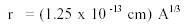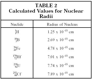 where: r = radius of the nucleus (cm) A = atomic mass number (dimensionless) The values of the nuclear radii for some light, intermediate, and heavy nuclides are shown in Table 2.