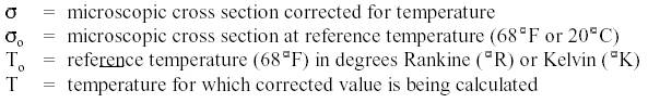 value for 68'F, and any cross sections which involve absorption (for example, The following formula is used to correct microscopic cross sections for temperature. Although the example illustrates absorption cross section, the same formula may be used to correct capture and fission cross sections.