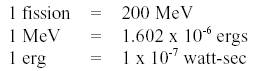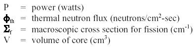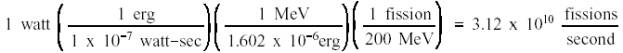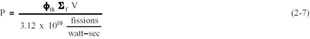 This is equivalent to stating that 3.12 x 101 fissions release 1 watt-second of energy. The power released in a reactor can be calculated based on Equation (2-6). Multiplying the reaction rate by the volume of the reactor results in the total fission rate for the entire reactor. Dividing by the number of fissions per watt-sec results in the power released by fission in the reactor in units of watts. This relationship is shown mathematically in Equation (2-7) below.